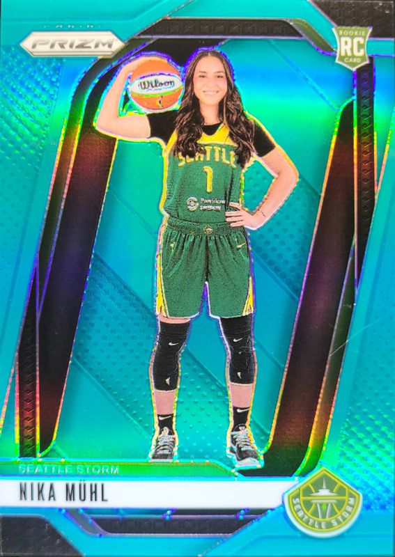 The Nika Muhl 2024 Prizm WNBA #146 Teal /49 Rookie card is 1 of 113 Nika Muhl's card variations in the 2024 Prizm WNBA set being tracked by Sports Card Investor, including #75 Base, #146 Base, #146 Rookie Variation, #146 Blue Velocity, and #75 Blue Velocity.