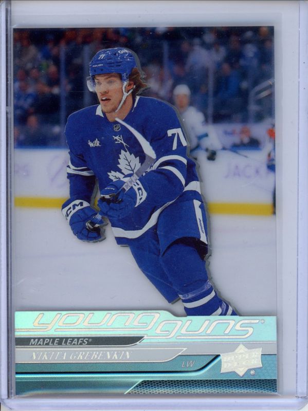 The Nikita Grebenkin 2024 Upper Deck Extended Series #714 2024-25 Update - Acetate Young Guns Rookie card is 1 of 27 Nikita Grebenkin's card variations in the 2024 Upper Deck Extended Series set being tracked by Sports Card Investor, including Base, Young Guns Base, Clear Cut, Outburst, and Young Guns - Clear Cut.