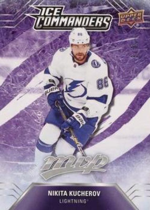 The Nikita Kucherov 2019 Upper Deck MVP #IC-1 Ice Commanders Leaderboard Achievements card is 1 of 27 Nikita Kucherov's card variations in the 2019 Upper Deck MVP set being tracked by Sports Card Investor, including Base, Blue, Gold Script, Silver Script, and Super Script /25.