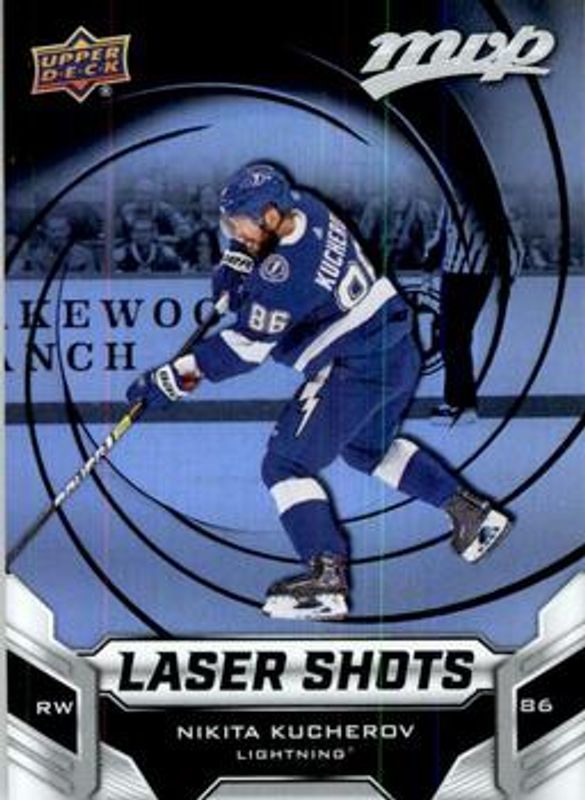 The Nikita Kucherov 2019 Upper Deck MVP #S-8 Laser Shots card is 1 of 27 Nikita Kucherov's card variations in the 2019 Upper Deck MVP set being tracked by Sports Card Investor, including Base, Blue, Gold Script, Silver Script, and Super Script /25.