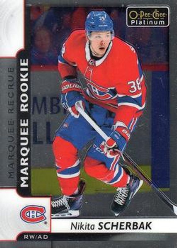 The Nikita Scherbak 2017 O-Pee-Chee Platinum #184 Base Rookie card is 1 of 28 Nikita Scherbak's card variations in the 2017 O-Pee-Chee Platinum set being tracked by Sports Card Investor, including Rainbow, Violet Pixels, Red Prism /199, Royal Blue Cubes /99, and Seismic Gold /50.