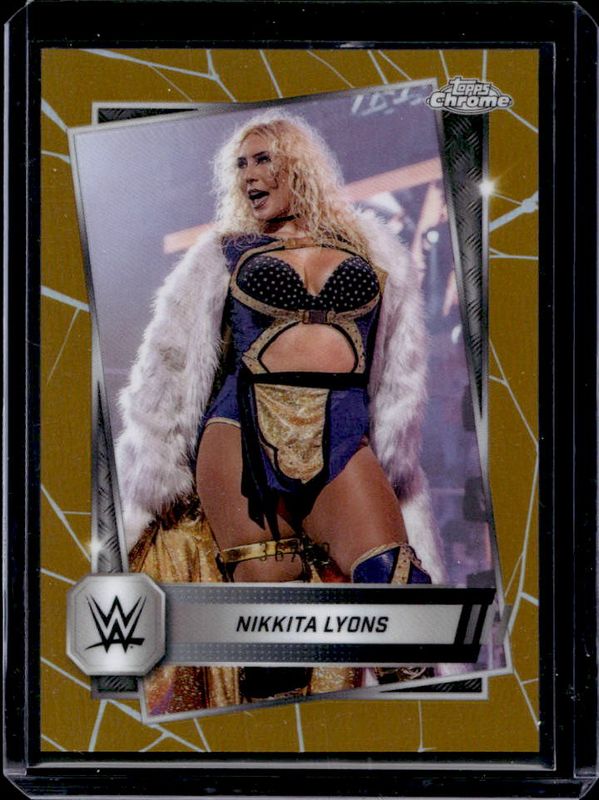 The Nikkita Lyons 2025 Topps Chrome WWE #171 Gold Refractor /50 card is 1 of 59 Nikkita Lyons' card variations in the 2025 Topps Chrome WWE set being tracked by Sports Card Investor, including Base, Black & Gold Refractor, Geometric Refractor, Neon Green & Black Refractor, and Pink Shimmer Refractor.