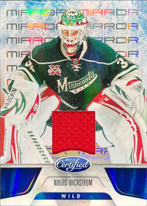 The Niklas Backstrom 2011 Certified #102 Mirror Blue Materials /99 card is 1 of 42 Niklas Backstrom's card variations in the 2011 Certified set being tracked by Sports Card Investor, including Base /499, Totally Silver, Mirror Red /199, Mirror Red Materials Dual /150, and Mirror Blue /99.