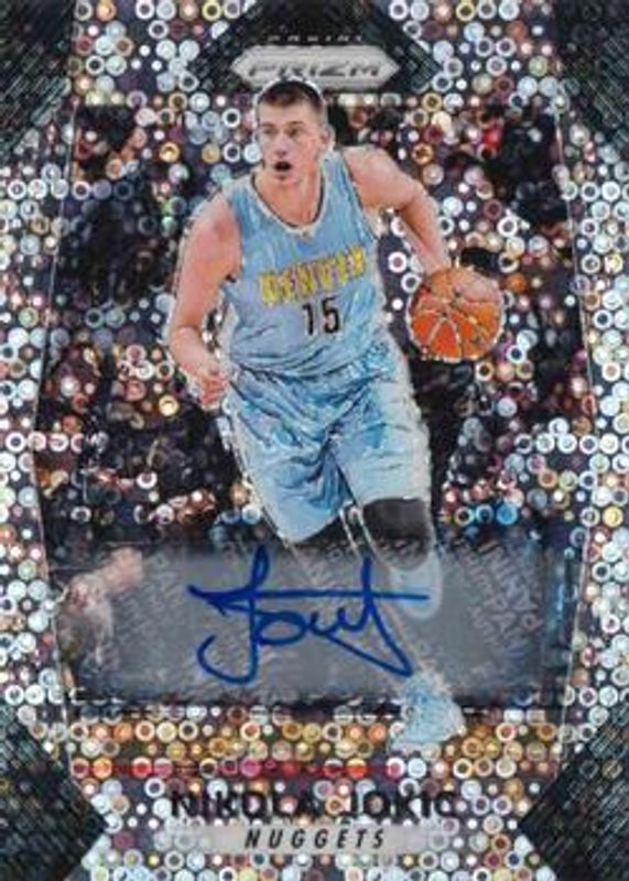 The Nikola Jokic 2017 Prizm #166 Autographs - Fast Break card is 1 of 45 Nikola Jokic's card variations in the 2017 Prizm set being tracked by Sports Card Investor, including Base, Fast Break, Green, Hyper, and Red White Blue.