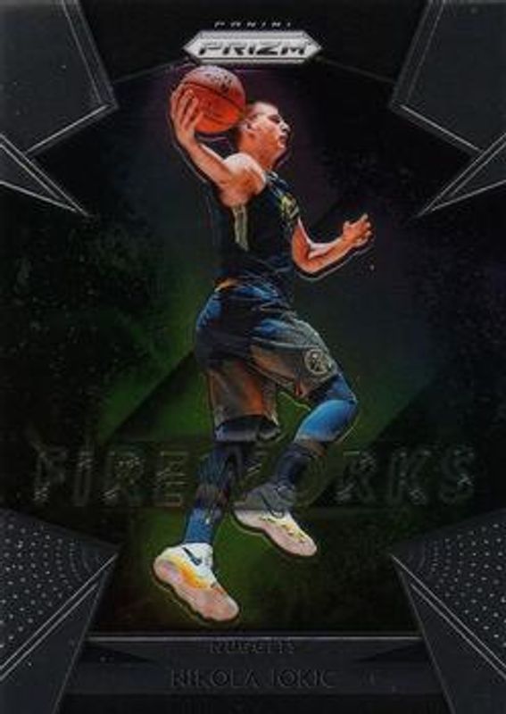 The Nikola Jokic 2018 Prizm #21 Fireworks card is 1 of 43 Nikola Jokic's card variations in the 2018 Prizm set being tracked by Sports Card Investor, including Base, Choice Blue Yellow Green, Fast Break, Green, and Purple Wave.
