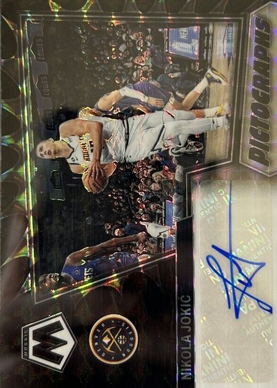 This card is 1 of 8 Nikola Jokic's card variations in the 2022 Mosaic set being tracked by Sports Card Investor, including Pictographs Autographs, Pictographs Autographs - Choice, Pictographs Autographs - Red Wave, Straight Fire, and Pictographs Autographs - Blue /49.
