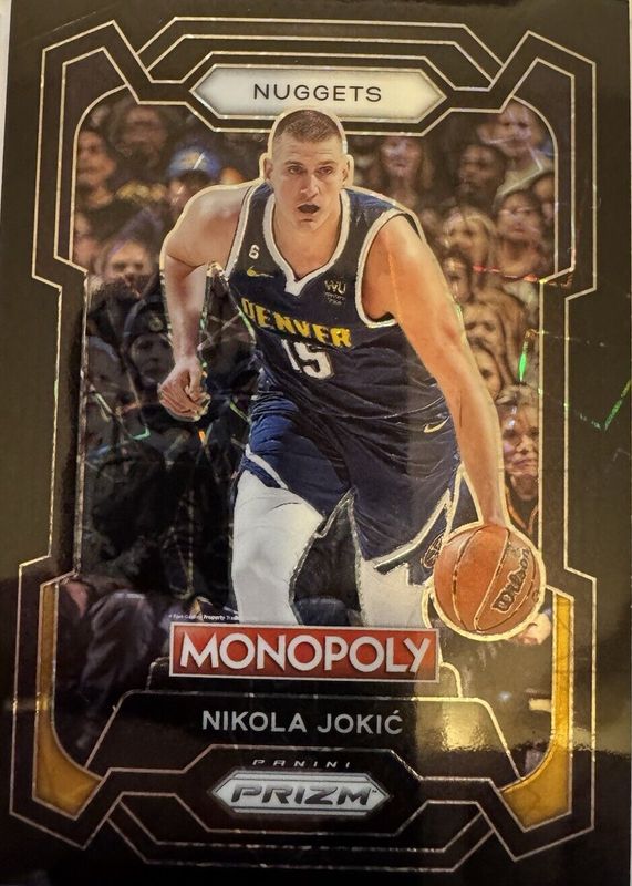 This card is 1 of 63 Nikola Jokic's card variations in the 2023 Prizm Monopoly set being tracked by Sports Card Investor, including Base, Boardwalk Blue Tiger Stripe, Free Parking, GO Space, and Handshake Deal.