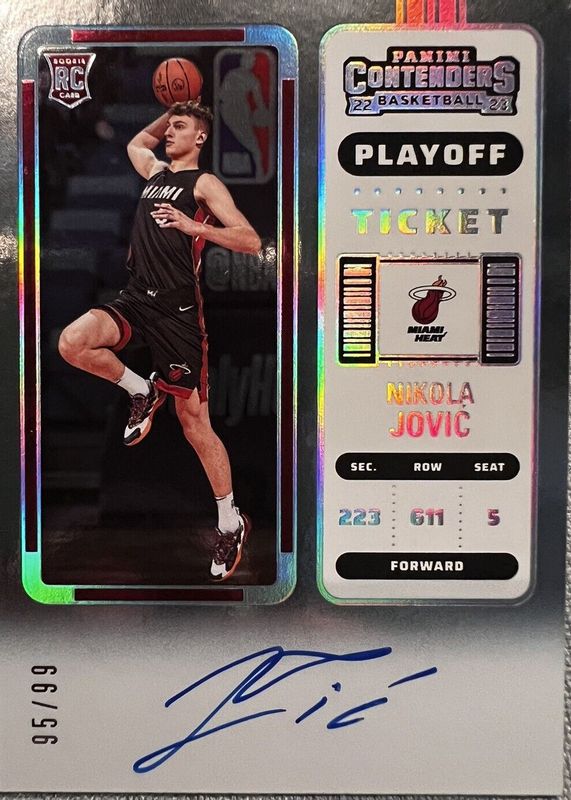 The Nikola Jovic 2022 Contenders #135 Rookie Ticket Auto - Playoff Ticket /99 card in Raw condition has not changed in price in the last 30 days and was last sold for $64.00 .