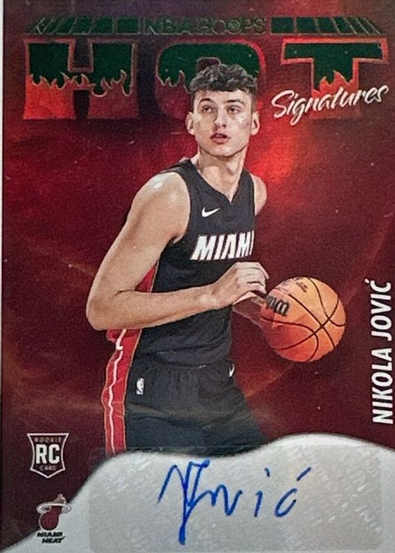 The Nikola Jovic 2022 Hoops #HSR-NKJ Hot Signatures Rookies - Green card in Raw condition has not changed in price in the last 30 days and was last sold for $10.50 .