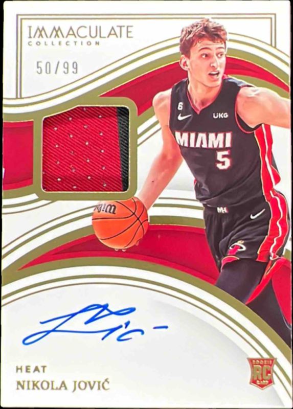 The Nikola Jovic 2022 Immaculate #113 Base /99 Rookie card is 1 of 29 Nikola Jovic's card variations in the 2022 Immaculate set being tracked by Sports Card Investor, including Red /49, Gold /10, Premium Patch Autographs, Premium Patch Autographs - FOTL, and Premium Patch Autographs - Gold.