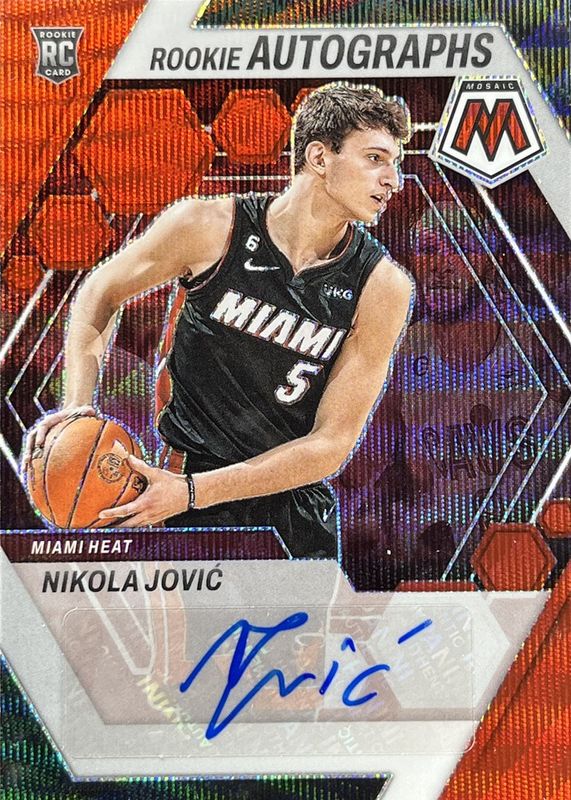 The Nikola Jovic 2022 Mosaic #RA-JOV Rookie Autographs - Red Wave card in Raw condition has not changed in price in the last 30 days and was last sold for $8.50 .
