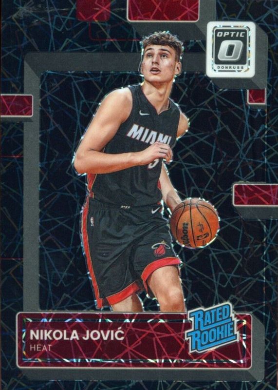 This card is 1 of 62 Nikola Jovic's card variations in the 2022 Optic set being tracked by Sports Card Investor, including Base, Checkerboard, Choice Red & Green, Fast Break, and Green Shock.