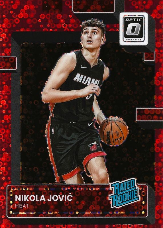 This card is 1 of 62 Nikola Jovic's card variations in the 2022 Optic set being tracked by Sports Card Investor, including Base, Checkerboard, Choice Red & Green, Fast Break, and Green Shock.