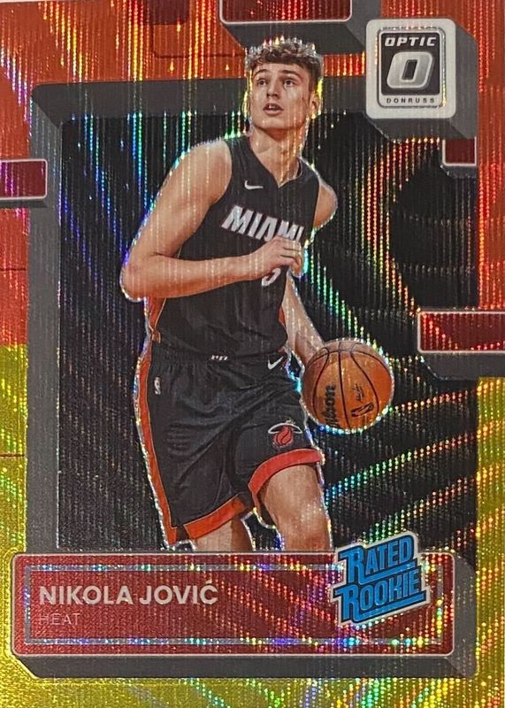 Best Prices Available For Sale of Nikola Jovic 2022 Optic #224 Red & Gold Wave /99