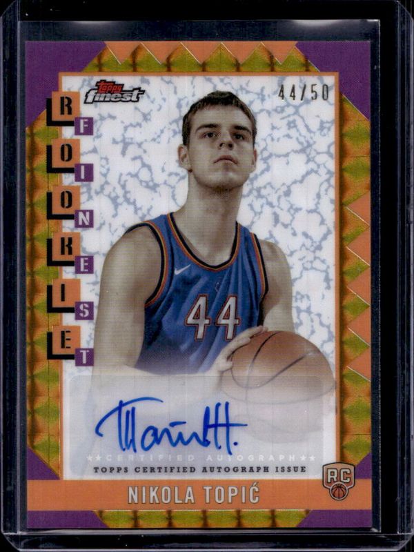 The Nikola Topic 2024 Topps Finest #RFA-NT Rookie Finest Autographs - Gold Geometric Refractor /50 card is 1 of 116 Nikola Topic's card variations in the 2024 Topps Finest set being tracked by Sports Card Investor, including Arrivals, Arrivals - Geometric Refractor, Arrivals - Refractor, Arrivals - X-Fractor, and Base Common.