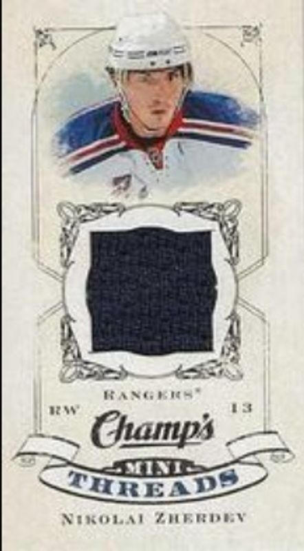 The Nikolai Zherdev 2008 Upper Deck Champ's #CT-NZ Mini Threads card is 1 of 6 Nikolai Zherdev's card variations in the 2008 Upper Deck Champ's set being tracked by Sports Card Investor, including Mini, Mini Blue Backs, Mini Brown Backs, Mini Purple Backs, and Mini Red Backs.