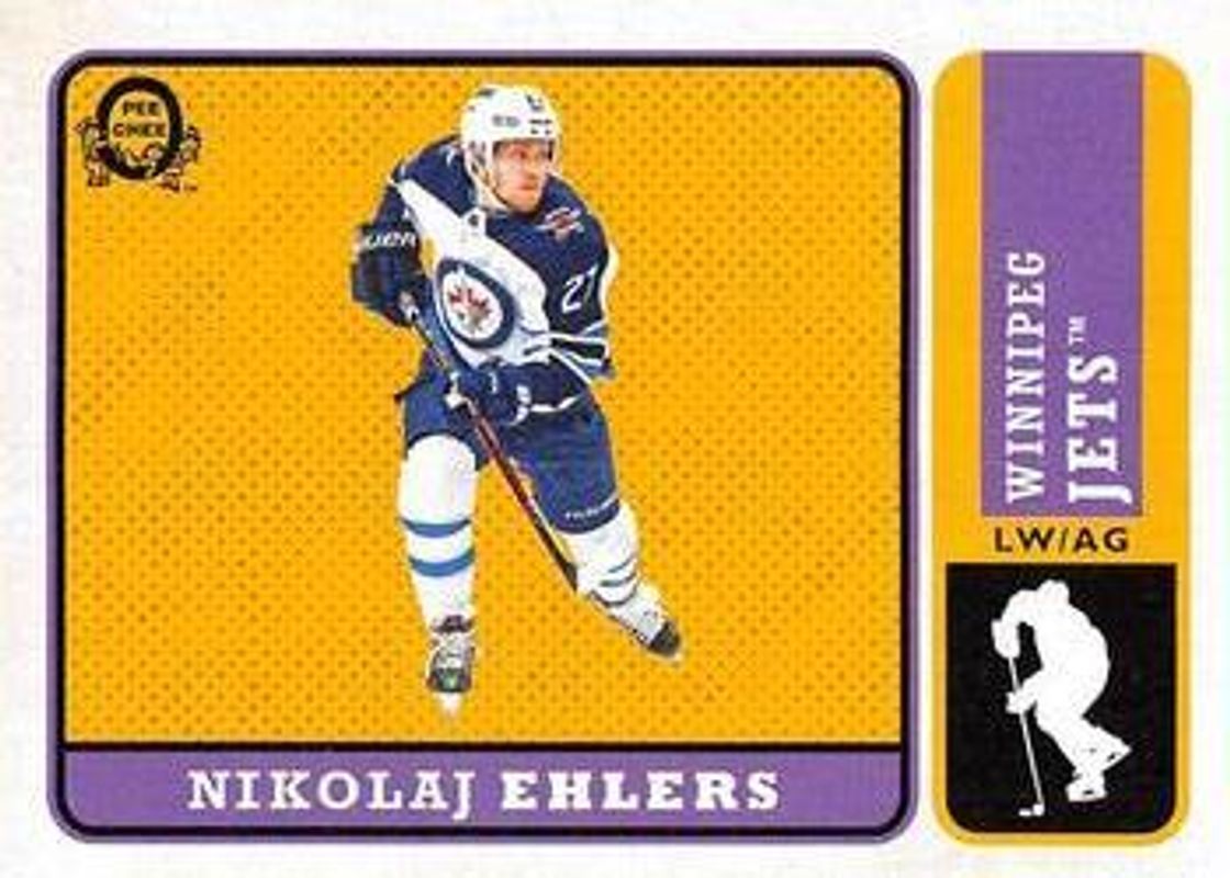 The Nikolaj Ehlers 2018 O-Pee-Chee #58 Retro Blank Back card is 1 of 12 Nikolaj Ehlers' card variations in the 2018 O-Pee-Chee set being tracked by Sports Card Investor, including Base, Gold Border Glossy, Retro, Retro No Name Scratch Off, and Silver.