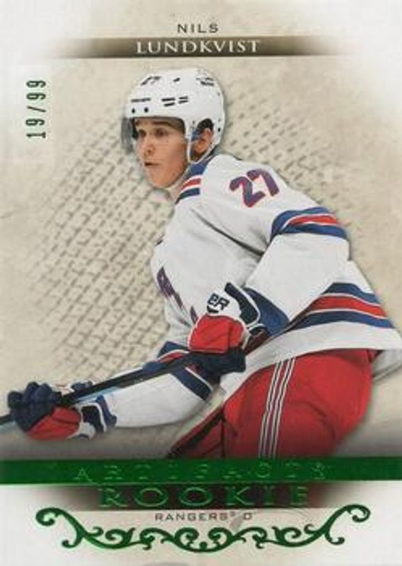 The Nils Lundkvist 2021 Upper Deck Artifacts #RED200 Emerald /99 Rookie card is 1 of 3 Nils Lundkvist's card variations in the 2021 Upper Deck Artifacts set being tracked by Sports Card Investor, including Base /999, and Autographed Silver Roman Numerals.