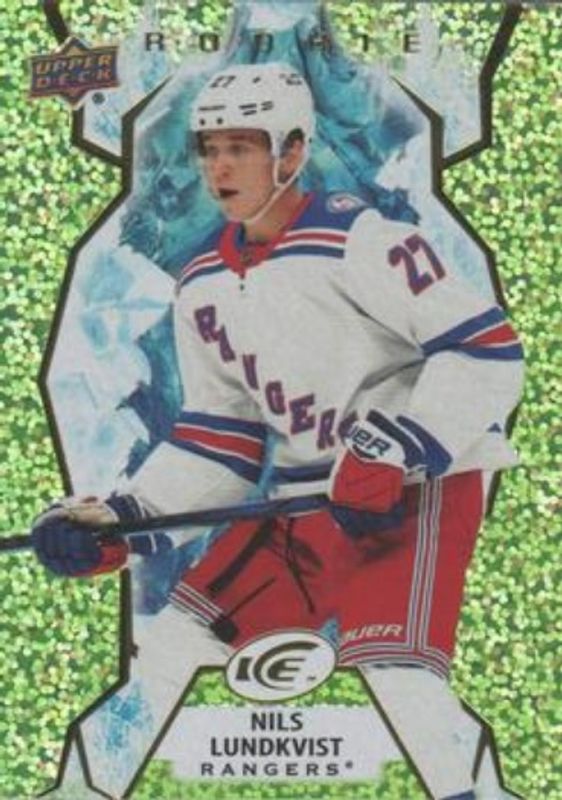 The Nils Lundkvist 2021 Upper Deck Ice #149 Green /799 Rookie card is 1 of 39 Nils Lundkvist's card variations in the 2021 Upper Deck Ice set being tracked by Sports Card Investor, including #149 Base /999, #238 Base /999, #149 Ice Blue, #149 Jersey, and #149 Lavender.