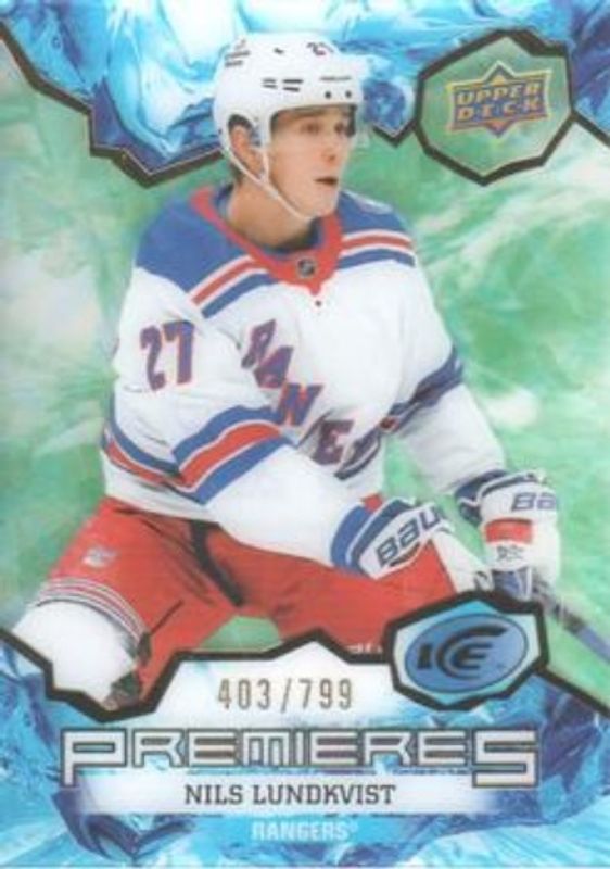 The Nils Lundkvist 2021 Upper Deck Ice #238 Green /799 Rookie card is 1 of 39 Nils Lundkvist's card variations in the 2021 Upper Deck Ice set being tracked by Sports Card Investor, including #149 Base /999, #238 Base /999, #149 Ice Blue, #149 Jersey, and #149 Lavender.