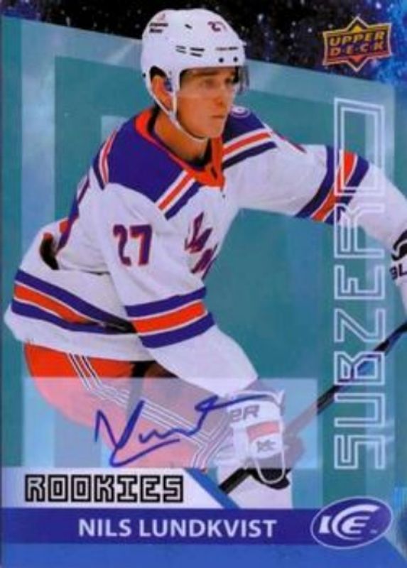 The Nils Lundkvist 2021 Upper Deck Ice #SZ-39 Sub Zero Blue Autographs Rookie card is 1 of 39 Nils Lundkvist's card variations in the 2021 Upper Deck Ice set being tracked by Sports Card Investor, including #149 Base /999, #238 Base /999, #149 Ice Blue, #149 Jersey, and #149 Lavender.