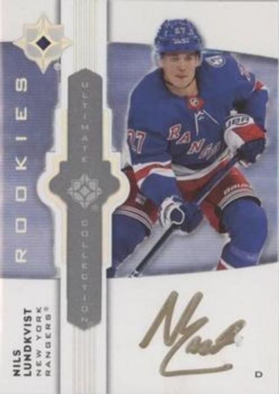The Nils Lundkvist 2021 Upper Deck Ultimate Collection #UE-NL Ultimate Emblems - Auto Rookie card is 1 of 29 Nils Lundkvist's card variations in the 2021 Upper Deck Ultimate Collection set being tracked by Sports Card Investor, including Base /299, 2000 Ultimate Signatures Retro, 2000 Ultimate Signatures Retro Rookies, Ultimate Emblems Rookies - Auto, and Ultimate Introductions.