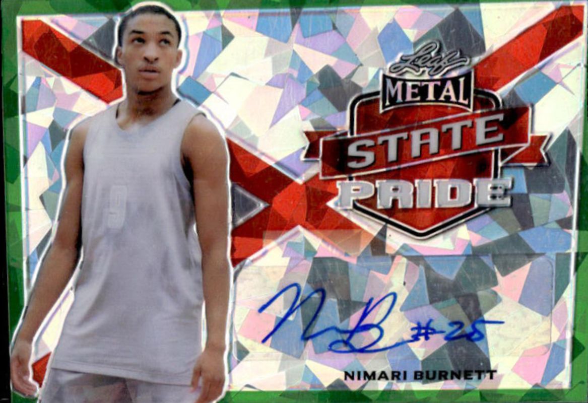 The Nimari Burnett 2021 Leaf Metal #SP-NB2 State Pride Autographs - Green Crystal /5 card is 1 of 88 Nimari Burnett's card variations in the 2021 Leaf Metal set being tracked by Sports Card Investor, including Base, Silver Crystal, Silver Mojo, Silver Wave, and Blue Rainbow /50.