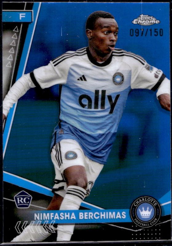 The Nimfasha Berchimas 2024 Topps Chrome MLS #145 Blue Refractor /150 card is 1 of 34 Nimfasha Berchimas' card variations in the 2024 Topps Chrome MLS set being tracked by Sports Card Investor, including Base, Aqua Lava Refractor, Gold Lava Refractor, Neon Green Lava Refractor, and Prism Refractor.