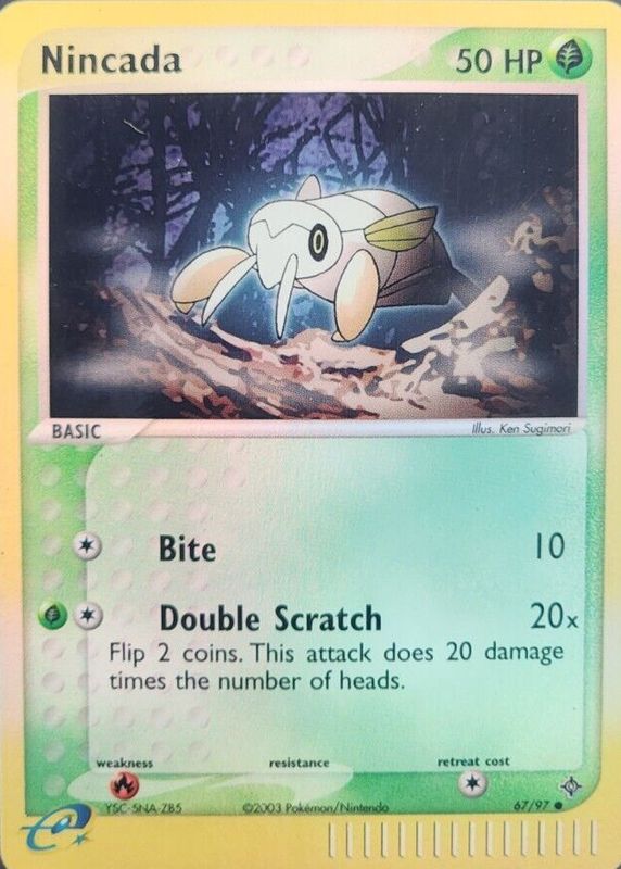 The Nincada 2003 EX: Dragon #67/97 Reverse Holo card in Raw TCG (Near Mint) condition has not changed in price in the last 30 days and was last sold for $4.99 .