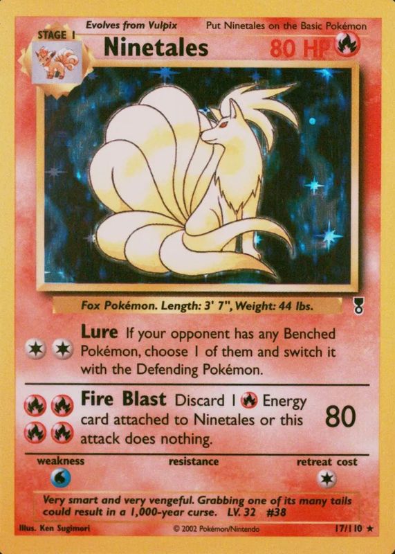 The Ninetales 2002 Legendary Collection #17 Holo card in Raw TCG (Lightly Played) condition has not changed in price in the last 30 days and was last sold for $10.00 .