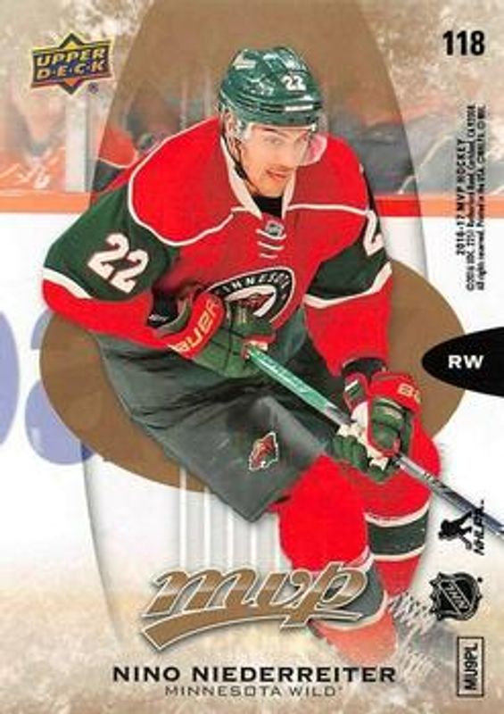 The Nino Niederreiter 2016 Upper Deck MVP #118 Puzzle Back card is 1 of 11 Nino Niederreiter's card variations in the 2016 Upper Deck MVP set being tracked by Sports Card Investor, including Base, Colors & Contours, Green Script, Silver Script, and Gold Script /135.