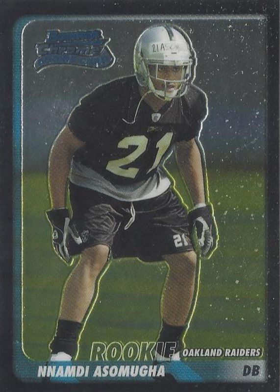 The Nnamdi Asomugha 2003 Bowman Chrome #211 Base Rookie card in Raw condition has moved down -$1.05 (-6.9%) in the last 30 days and was last sold for $14.24 .