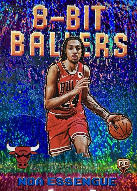 The Noa Essengue 2025 Topps #8B-38 8-Bit Ballers - Blue Holo Foil /150 Rookie card in Raw condition has moved down -$1.50 (-42.9%) in the last 30 days and was last sold for $2.00 .