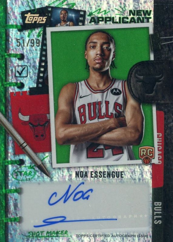 The Noa Essengue 2025 Topps #NA-NE New Applicants Autographs - Green Holo Foil /99 Rookie card in Raw condition has moved up $13.95 (+213%) in the last 30 days and was last sold for $20.50 .