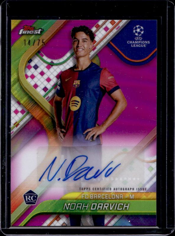 The Noah Darvich 2024 Topps Finest UEFA Club Competitions #BA-ND Base Autographs - Magenta Refractor /75 card is 1 of 52 Noah Darvich's card variations in the 2024 Topps Finest UEFA Club Competitions set being tracked by Sports Card Investor, including Base, Refractor, Purple Refractor /299, Sky Blue Refractor /275, and Pink RayWave Refractor /250.
