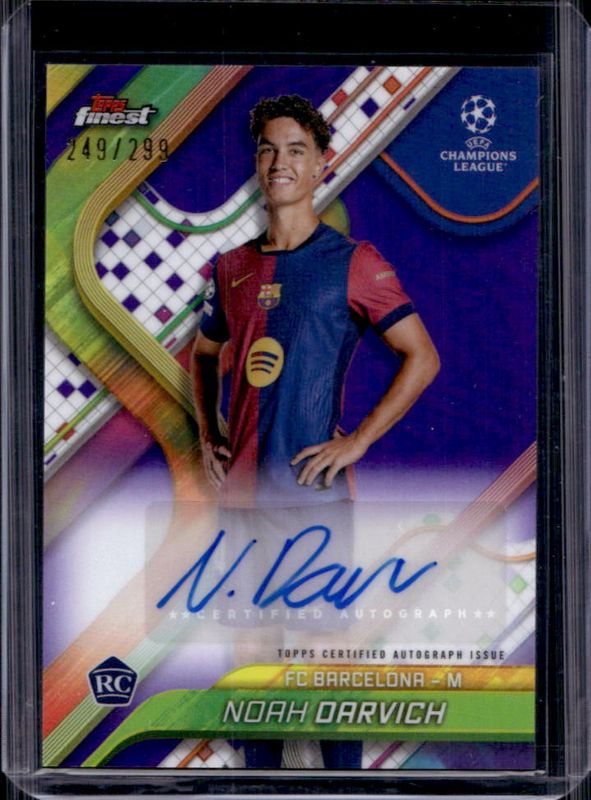 The Noah Darvich 2024 Topps Finest UEFA Club Competitions #BA-ND Base Autographs - Purple Refractor /299 card is 1 of 52 Noah Darvich's card variations in the 2024 Topps Finest UEFA Club Competitions set being tracked by Sports Card Investor, including Base, Refractor, Purple Refractor /299, Sky Blue Refractor /275, and Pink RayWave Refractor /250.