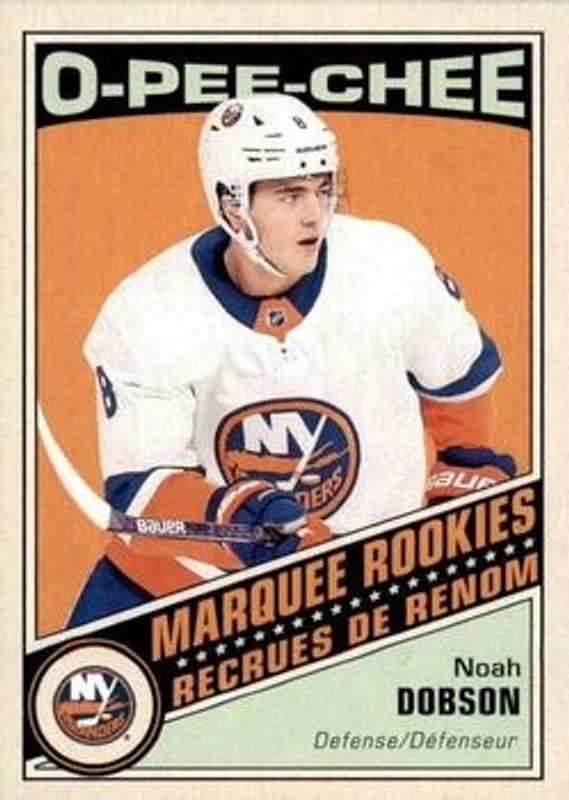 The Noah Dobson 2019 Upper Deck #634 2019 O-Pee-Chee Update Retro Rookie card is 1 of 44 Noah Dobson's card variations in the 2019 Upper Deck set being tracked by Sports Card Investor, including Young Guns Base, Young Guns Canvas, Young Guns - Clear Cut, Young Guns - Clear Cut Exclusives, and Young Guns - Silver Foil.