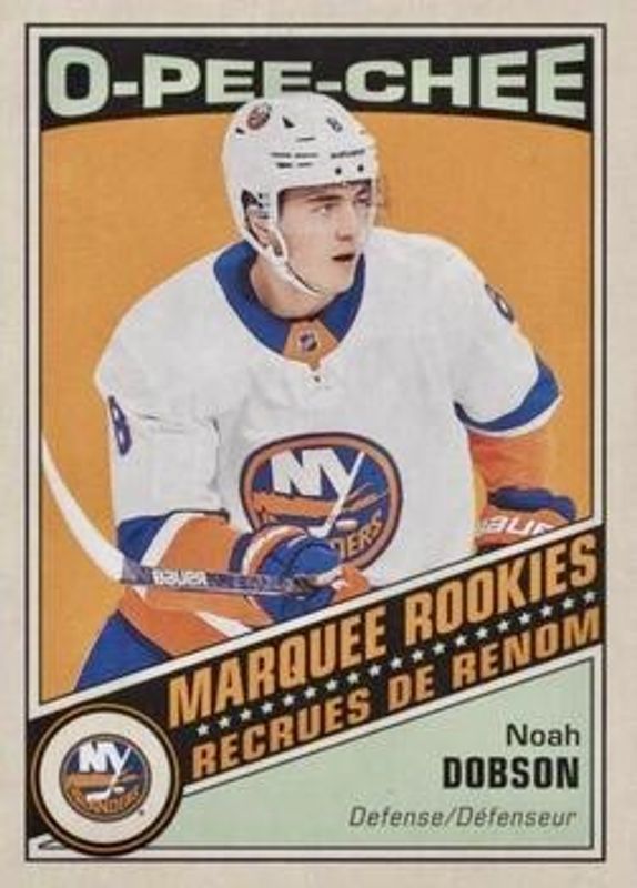 The Noah Dobson 2019 Upper Deck #634 2019 O-Pee-Chee Update Retro Blank Back Rookie card is 1 of 44 Noah Dobson's card variations in the 2019 Upper Deck set being tracked by Sports Card Investor, including Young Guns Base, Young Guns Canvas, Young Guns - Clear Cut, Young Guns - Clear Cut Exclusives, and Young Guns - Silver Foil.