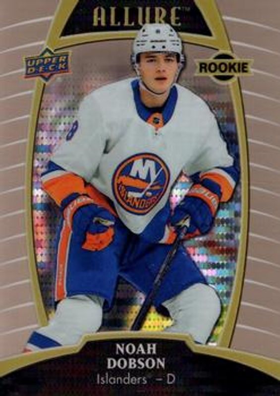 The Noah Dobson 2019 Upper Deck Allure #96 Pewter Rookie card is 1 of 40 Noah Dobson's card variations in the 2019 Upper Deck Allure set being tracked by Sports Card Investor, including #128 Base, #96 Base, #128 Pink Diamond, #96 Red Rainbow, and #96 White Rainbow.