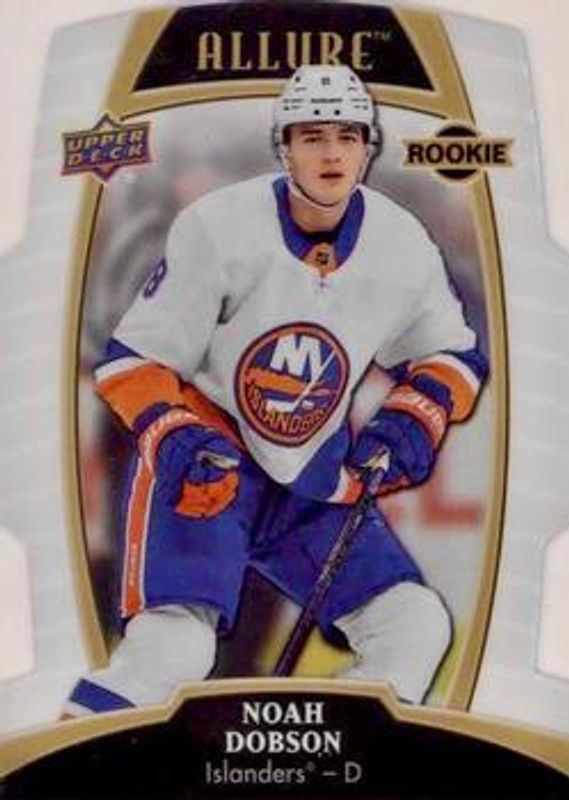 The Noah Dobson 2019 Upper Deck Allure #96 White Rainbow Rookie card is 1 of 40 Noah Dobson's card variations in the 2019 Upper Deck Allure set being tracked by Sports Card Investor, including #128 Base, #96 Base, #96 Pewter, #128 Pink Diamond, and #96 Red Rainbow.