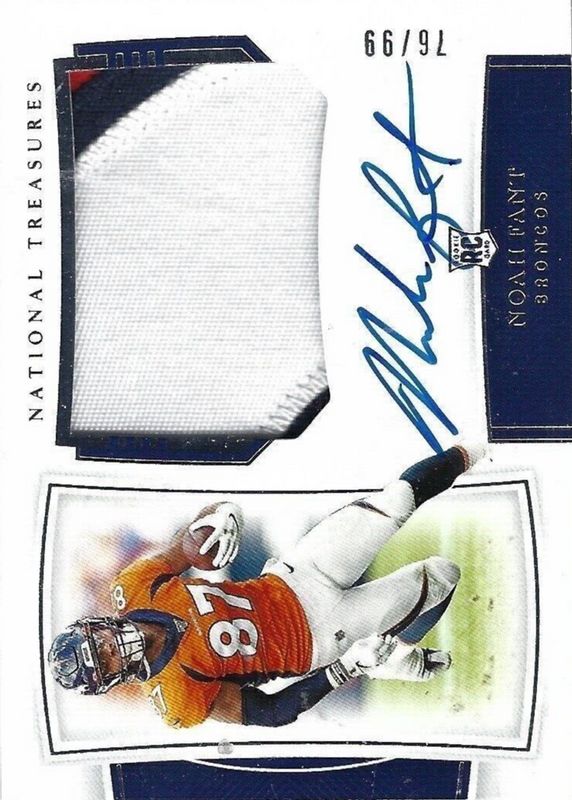 This card is 1 of 11 Noah Fant's card variations in the 2019 National Treasures set being tracked by Sports Card Investor, including Rookie Patch Auto - Green Jersey Number (/87), Rookie Patch Auto - Holo Silver /25, Rookie Patch Auto - Midnight /20, Rookie Patch Auto - Holo Gold /10, and Rookie Patch Auto - Black /5.