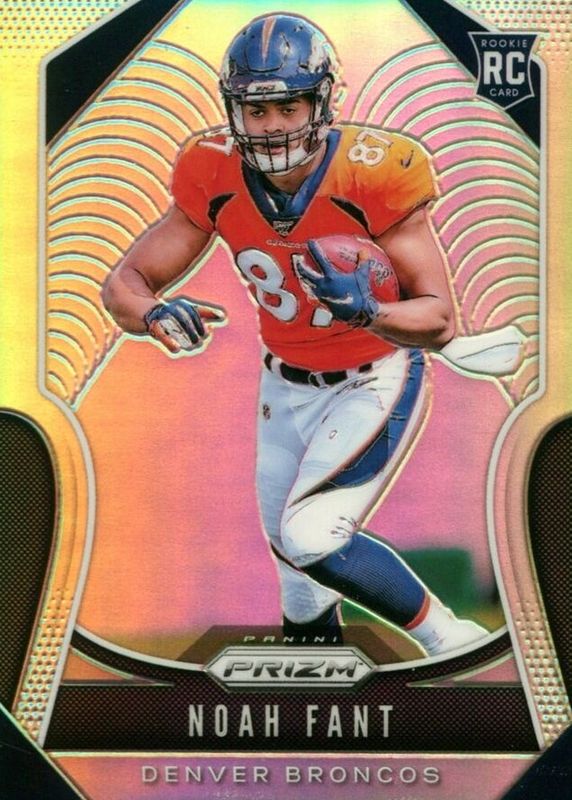 This card is 1 of 44 Noah Fant's card variations in the 2019 Prizm set being tracked by Sports Card Investor, including Base, Disco, Green, Lazer, and Neon Green Pulsar.
