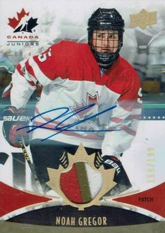 The Noah Gregor 2016 Upper Deck Team Canada Juniors #142 Gold Spectrum Men's Autographs Patch /125 card is 1 of 13 Noah Gregor's card variations in the 2016 Upper Deck Team Canada Juniors set being tracked by Sports Card Investor, including #79 Base, #142 Base, #79 Exclusives /175, #79 High Gloss Spectrum /25, and #79 Gold /16.