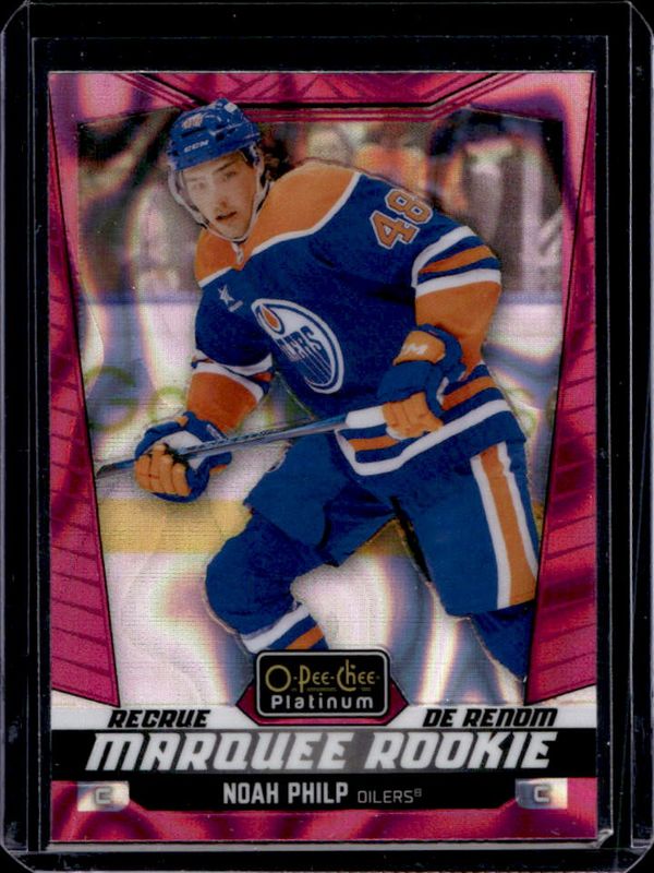 The Noah Philp 2024 O-Pee-Chee Platinum #295 Pink Magma Rookie card is 1 of 15 Noah Philp's card variations in the 2024 O-Pee-Chee Platinum set being tracked by Sports Card Investor, including Base, Neon Yellow Surge, Rainbow, Sunset, and Violet Pixels /299.