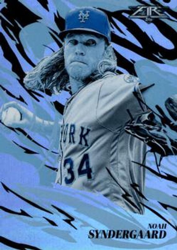 The Noah Syndergaard 2019 Topps Fire #FT-14 Flamethrowers - Blue Chip card is 1 of 22 Noah Syndergaard's card variations in the 2019 Topps Fire set being tracked by Sports Card Investor, including Base, Blue Chip, Flame, Gold Minted, and Onyx.