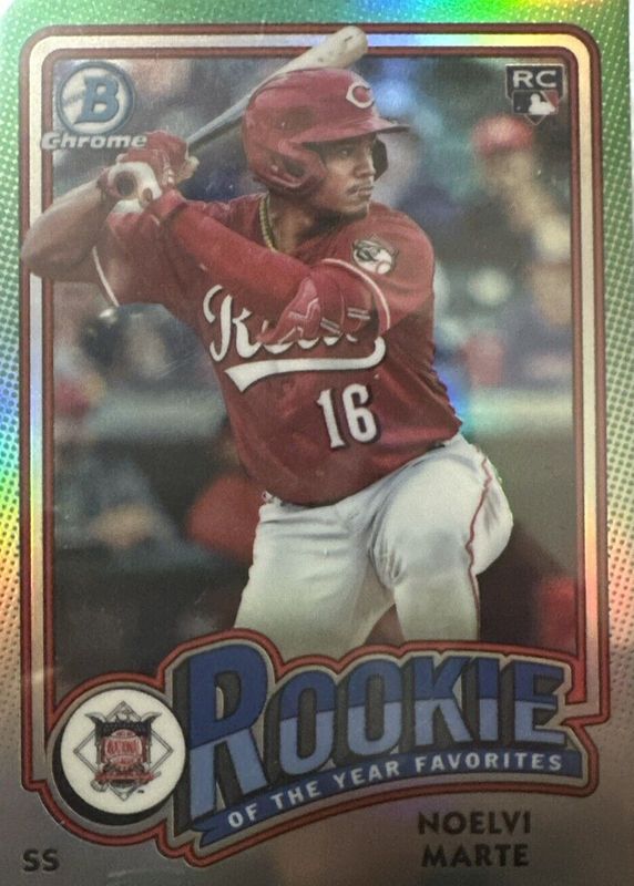The Noelvi Marte 2024 Bowman #ROY-4 Rookie of the Year Favorites - Gold Refractor /50 card in Raw condition has not changed in price in the last 30 days and was last sold for $40.00 .