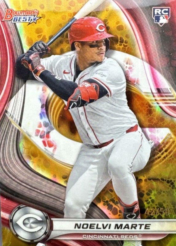 The Noelvi Marte 2024 Bowman's Best #19 Gold Refractor /50 Rookie card in Raw condition has not changed in price in the last 30 days and was last sold for $13.50 .