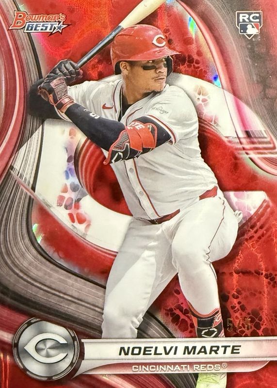 The Noelvi Marte 2024 Bowman's Best #19 Red Refractor /5 Rookie card in Raw condition has not changed in price in the last 30 days and was last sold for $54.00 .