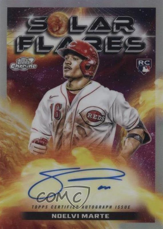 The Noelvi Marte 2024 Topps Chrome Cosmic #SFA-NM Solar Flare Autographs Rookie card in Raw condition has not changed in price in the last 30 days and was last sold for $26.00 .