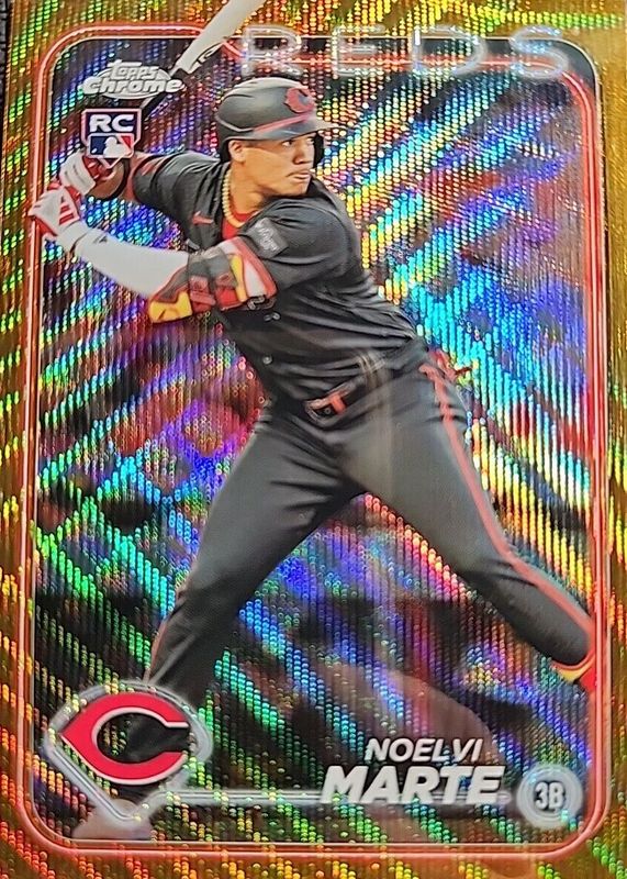 The Noelvi Marte 2024 Topps Chrome #177 Gold Wave Refractor /50 Rookie card in Raw condition has not changed in price in the last 30 days and was last sold for $37.50 .